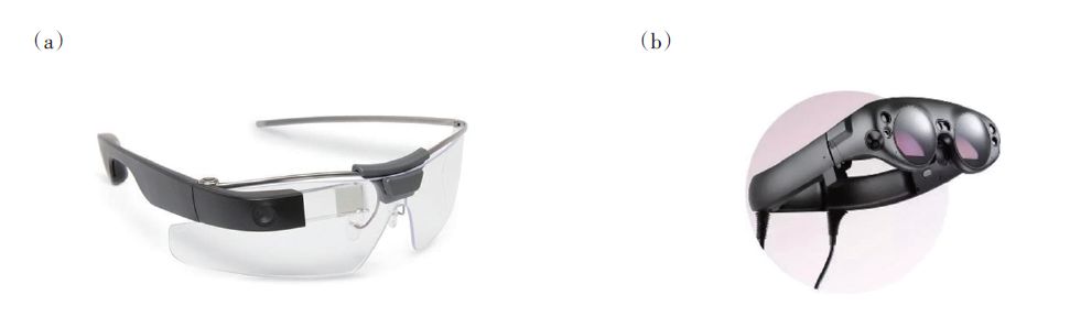 Google公司推出的Google Glass是一款光学透视式头盔显示器,其经过光学放大后将数据通过棱镜显示给用户(图5(a))。Google Glass可以通过声音控制,实现拍照、视频通话、全球定位系统(GPS)定位、文字处理、收发邮件等多种功能。Magic Leap公司发布了一款基于光场的头戴式增强现实设备Magic Leap One(图5(b))。这款设备利用外部摄像头和计算机视觉处理器实时追踪用户位置,同时在追踪过程中可以不断调整双眼的焦距,并将包含有深度信息的图像通过光场显示器显示出来。