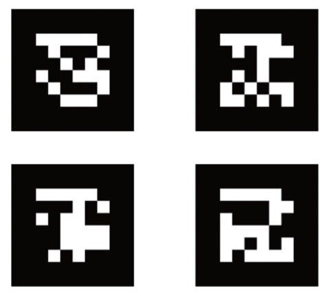 基于人工标志的方法一般将包含有特定人工标志的物体放置在真实场景中,通过对摄像机采集到的图像中的已知模板进行识别获得摄像机位姿,之后经过坐标系的变换即可将虚拟物体叠加到真实场景中。基于人工标志的方法最具代表性的是ARToolkit和ARTag。ARToolkit通过使用人工标志实现了快速准确的跟踪注册,但其在遮挡敏感;ARTag采用数字编码的方式在一定程度上增加了对遮挡的处理能力。图1展示了ARToolkit 中人工标志示例。图2展示了ARTag中的人工标志示例。