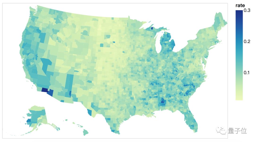 结合真实地理数据,展现美国每个县的失业率。