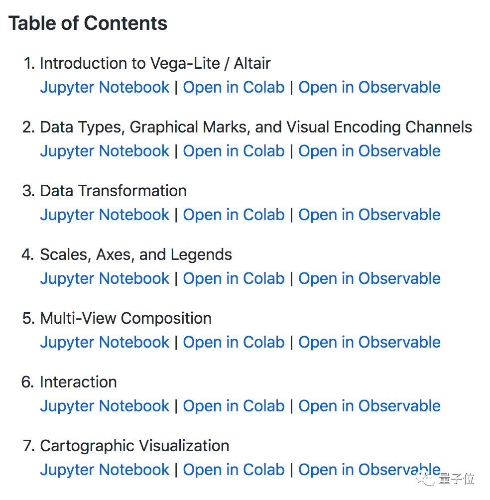 教程的作者非常友好,在Jupyter、Colab、Observable三个平台都准备了课程,你可以选择自己习惯的平台,或者直接去Colab上,用自己的数据体验一下。