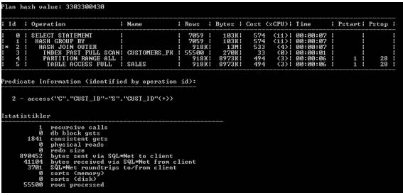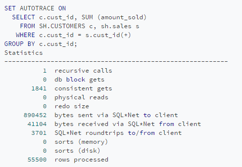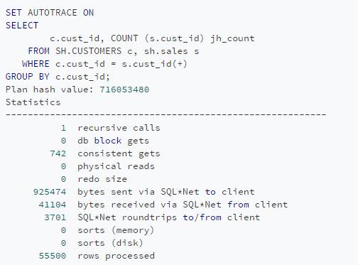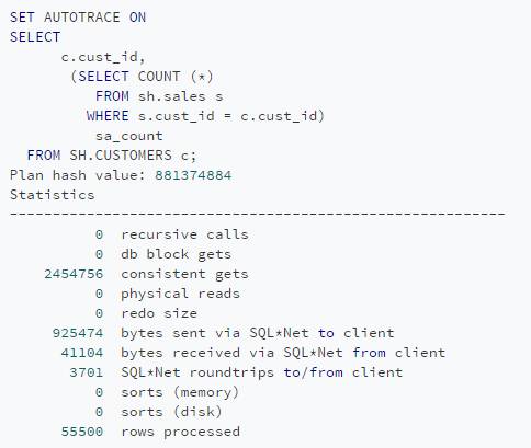 可以看到在两个查询的consistent gets数量之间的差异(当检查缓冲区缓存读到的块数据时)是巨大的。使用两种不同方法编写的查询在运行时导致不同时间。这种差别可以用性能来解释。