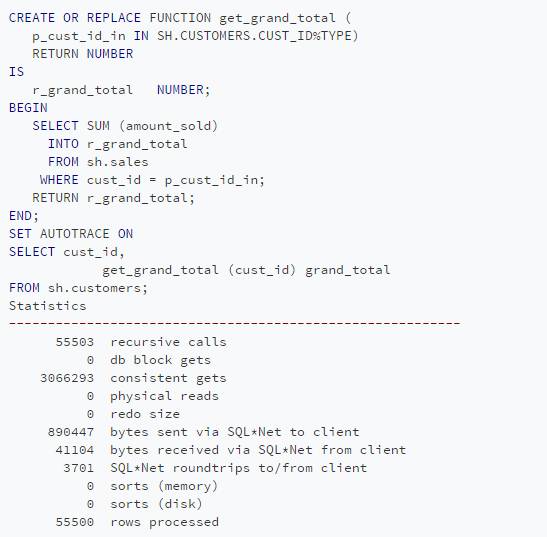 在另一个例子中,常见的习惯是在SQL语句中调用PL/SQL函数。作为过程式工作的例子,也是一种解决问题的方法。还有其他一些影响在SQL内调用PL/SQL代码性能的不利因素,但在本文中,不会提到性能问题。