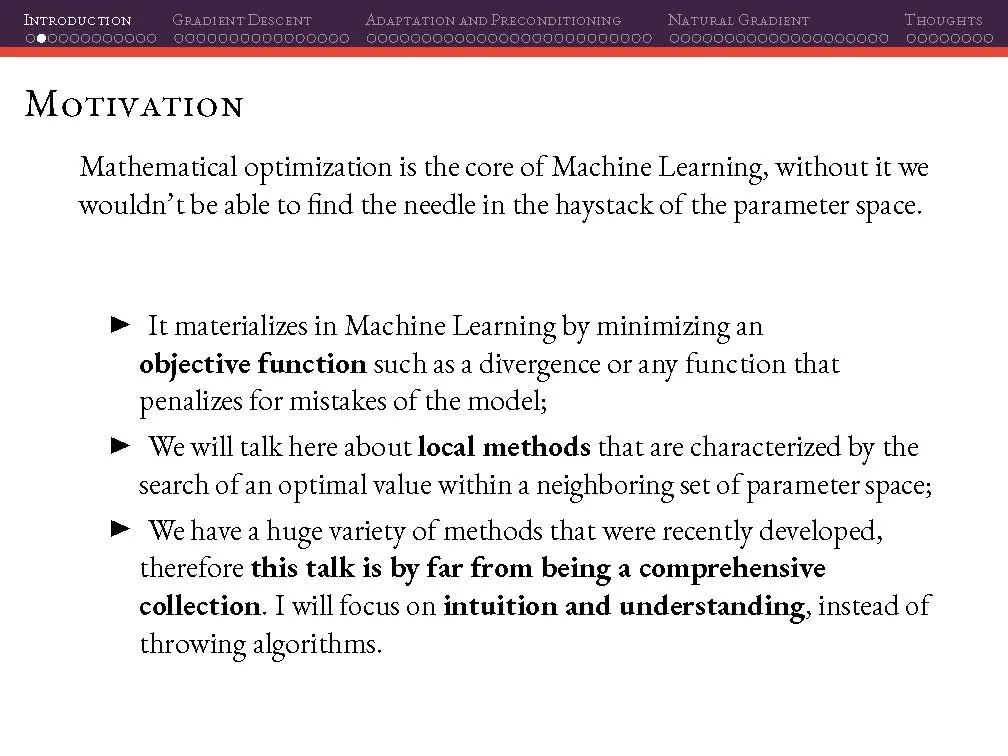 这个周末,我在阿雷格里港机器学习会议上做了一个关于深度学习的优化方法的演讲。在这个材料中,你会发现一阶方法的概述,二阶方法和一些二阶方法的近似以及自然梯度下降和近似。