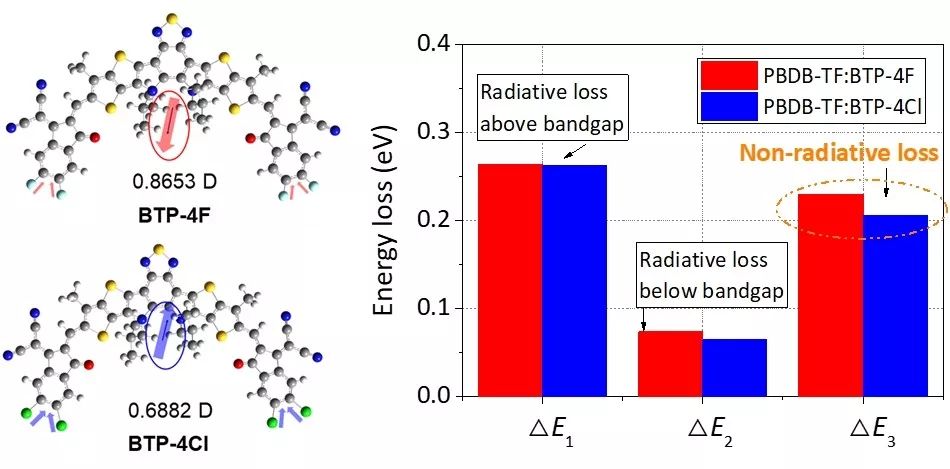 研究结果表明,相对于氟代材料(BTP-4F)的电池,基于BTP-4Cl电池性能的提升主要源于其具有较低的非辐射能量损耗。该工作证明了光伏材料分子的设计是一种降低非辐射能量损耗的有效途径,对OPV效率的进一步提升具有重要意义。