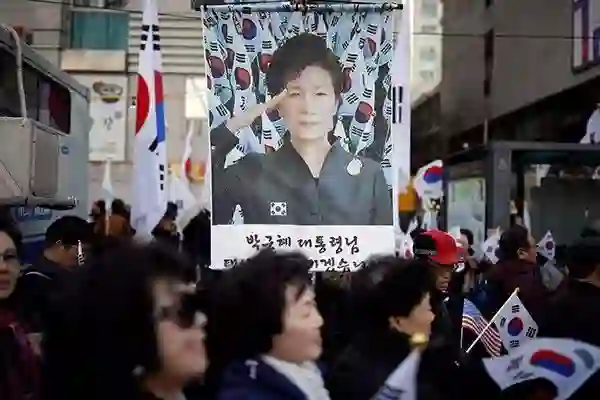 2017年3月9日,韩国首尔,“亲朴派”民众在宪法法院外集会,反对弹劾总统。