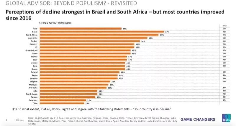 益普索的报告显示,相较于2016年,如今全球受访者的悲观情绪已经开始减弱了。平均来看,受访的24个国家中有44%的民众认为自己的国家正在倒退,相比2016年的数据(57%)有所下降。即使是在最为悲观的巴西,受访者不看好国家发展的比例亦从2016年时的72%下降了五个百分点。