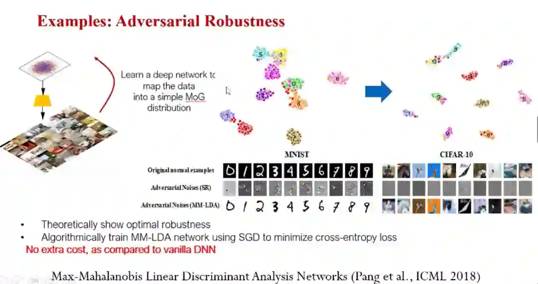 上图的例子是报告开始的时候提到的对抗性样本,即向真实样本中添加人眼不可见的噪声,导致深度学习模型发生预测错误的样本。在ICML2018 的一篇论文《 Max-Mahalanobis LinearDiscriminant Analysis Networks》,我们定义了一种特殊的高斯混合分布MMD,并且理论性地证明了如果输入分布是 MMD,那么线性判别分析(LDA)对于对抗样本有非常好的鲁棒性。基于这一发现,论文中提出了 MM-LDA 网络。简单而言,该网络将复杂的输入数据分布映射到服从 MMD 分布的隐藏特征空间,并使用 LDA 做最后的预测。