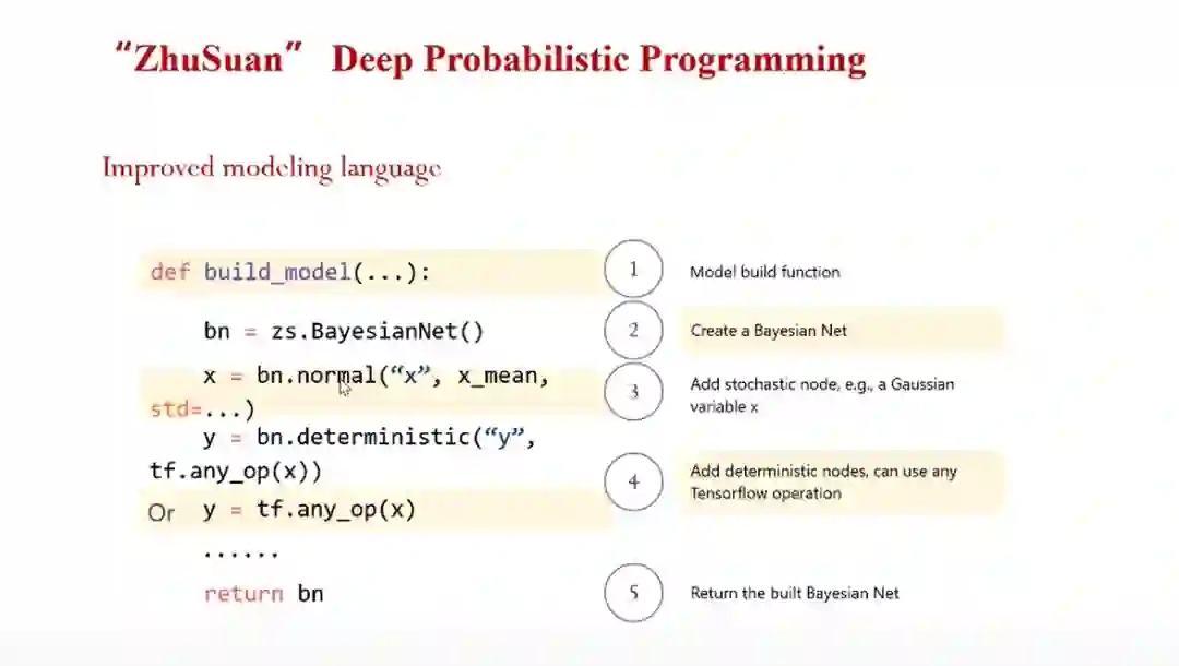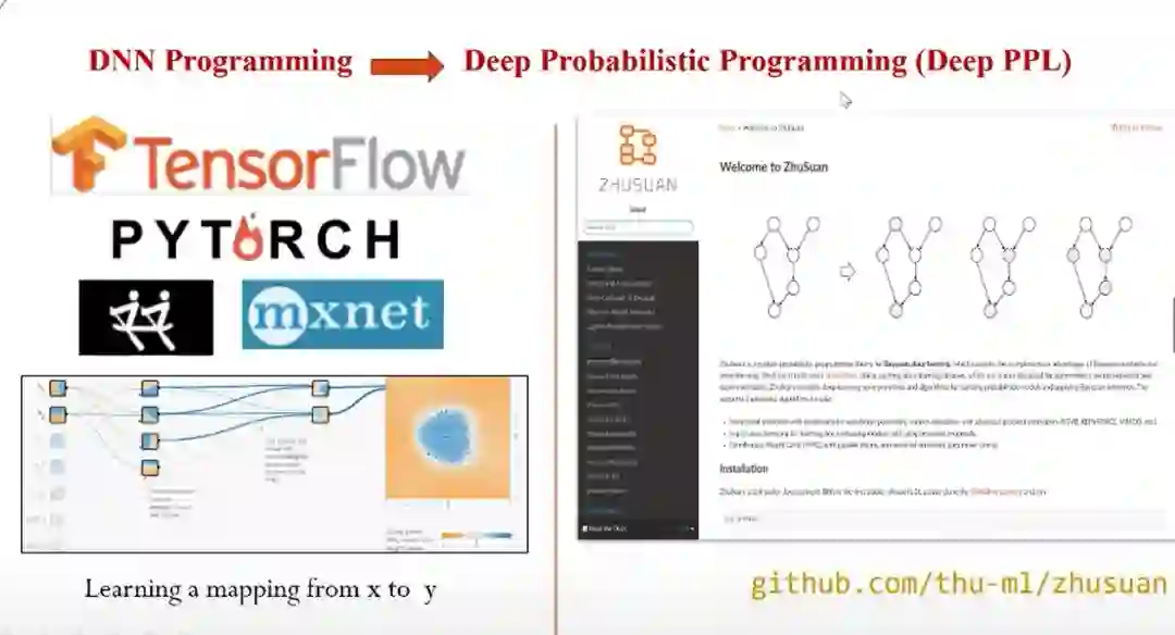 大在2013~2014年的时候,机器学习领域就在发展深度的概率编程的框架,我们组也做了“珠算”( https://zhusuan.readthedocs.io),是最早的深度概率编程库之一。作为一个构建于 TensorFlow 之上的用于生成模型(Generative Model)的 Python 库。和现有的主要为监督式任务设计的深度学习库不同,