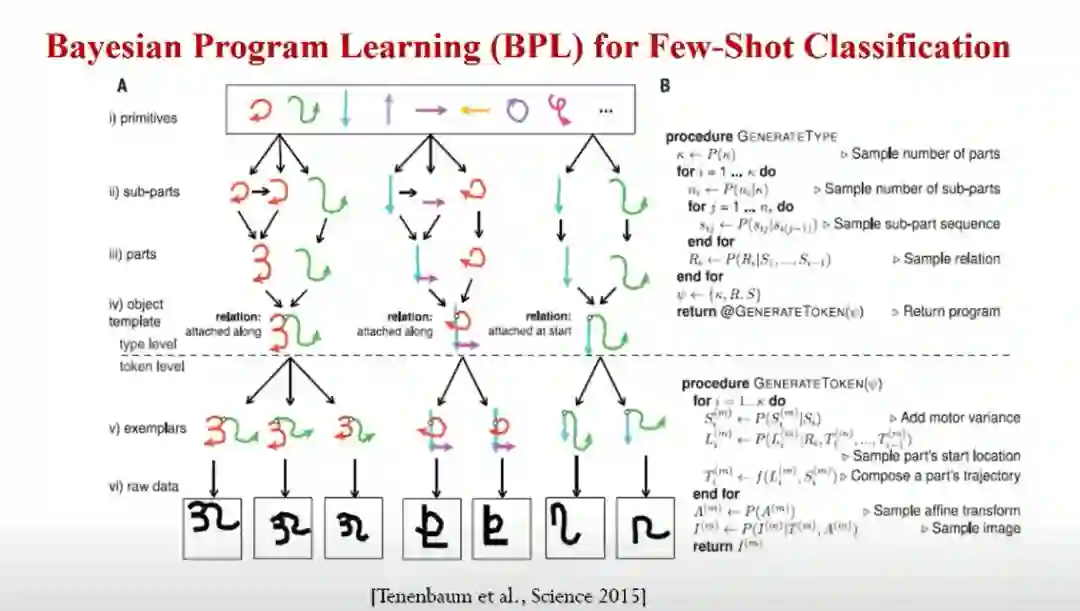 上面是MIT做的一个例子,主要针对小样本学习,当时MIT用贝叶斯建模的方法叫Bayesian Program Learning。其内涵是一个多层的贝叶斯模型,能够用一些基本的部件通过某种组合得到一些更大的部件,然后再在进行某种关系的组合,最后去用噪声渲染模型生成手写字符。