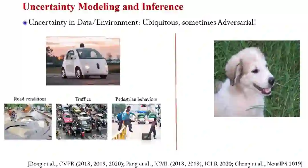再例如对抗样本研究(恶意干扰产生的不确定性),如果在一张图片中加上少量的噪音,虽然展示效果对人眼没有影响,而足以让人工神经网络产生误判。