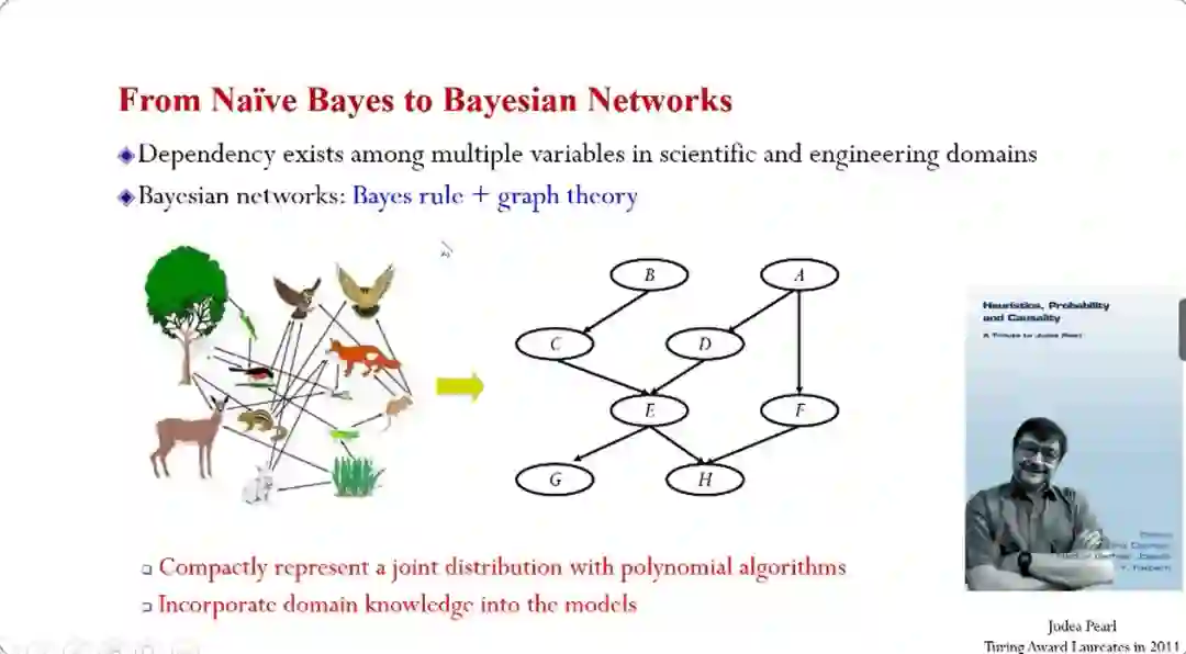 。例如食物链,上面很多物种之间存在依赖关系,这种关系并不是随机无规律的,其规律已经被生物学家洞察。所以,食物链的关系(联合分布)就可以用右边稀疏连接的图来简洁刻画,图上的每一个节点都是随机变量,线代表了点之间的关系,这种点与线之间的结构清晰表达了多个变量的联合分布。这种图结构的表达方式将指数级别的参数需求降到了多项式级别,同时也将专家的知识纳入到模型里。所以,贝叶斯更像是一种非常强大的建模语言。
