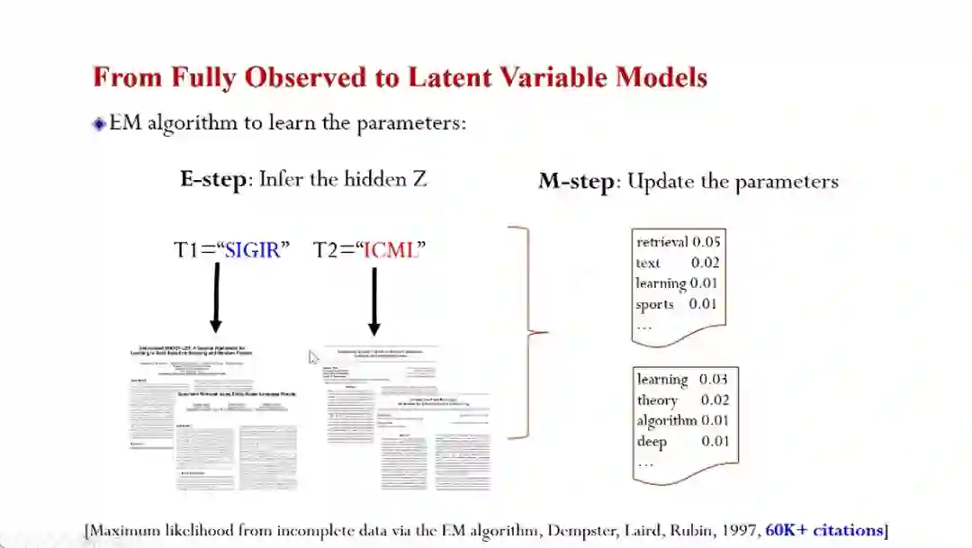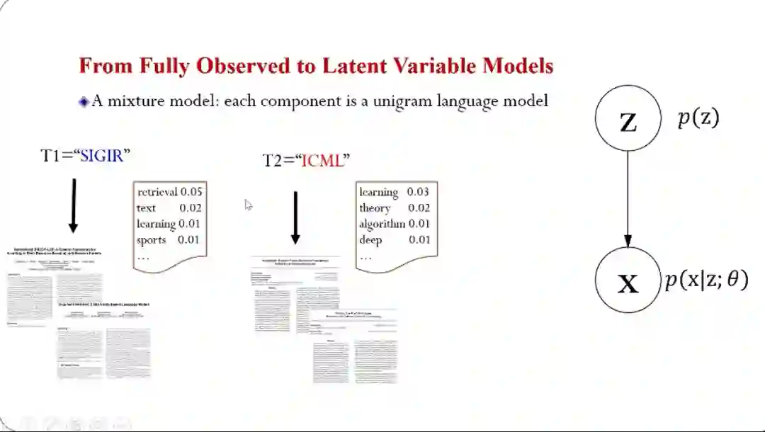 对于上面这个例子,我们可能会引入一个变量去表示,从而找到某一文档从哪一个会议中来,即可能来自SIGIR也可能来自ICML,对于不同的会议论文,如果用不同的语言模型进行描述的,就能准确刻画它们不同的风格。这种想法可以用上图右边所示的概率图模型进行描述。先对隐变量有一个先验分布,然后给定这个隐变量,再用相应的语言模型进行定义X,如此便能进行推断。也即给定观察到的X,就能找到“它”属于哪一类的文章。
