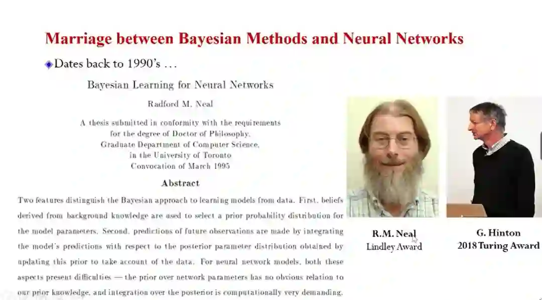 贝叶斯方法和深度学习方法的“联姻”可以追溯到上世纪90年代的甚至更早,当时大家主要研究的是如何用贝叶斯方法进行神经网络的计算,或者进行神经网络结构的选择。当时面临的困难和主要问题是数据缺乏和计算能力不足,所以很多神经网络训练的深度非常的浅。