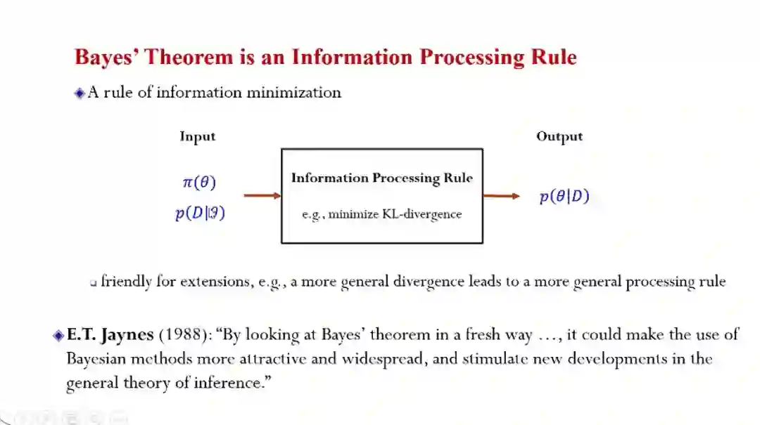 这种基于优化的解释,实际上在上世纪80年代就有统计学家提出过,E.T. Jaynes是比较有名的统计学家,对我们前面讲的优化解释做了一些comments,它给经典的贝叶斯提供了一个新颖的解释,可以让贝叶斯方法更广泛被应用,而且激发了新的发展。
