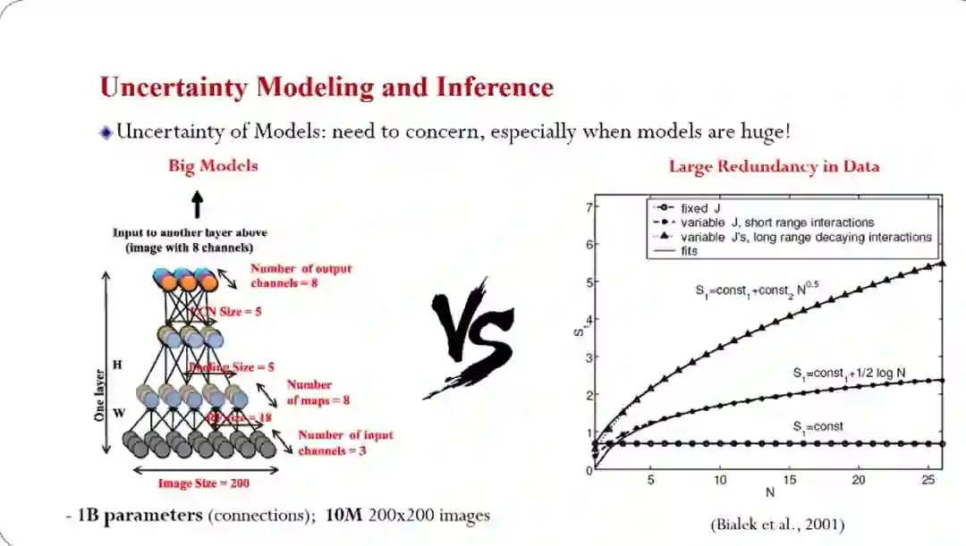 所以模型已经足够大,训练的重点应该在于数据量有多少。如上图所示,右边三条曲线刻画了“有用”信息的增长速度,其中最快的增长速度为N的1/2次方。这反映的事实是,有用信息的增长“跟”不上模型体量的增长速度。这种形式模型的不确定性,直观的体现为过拟合的现象。
