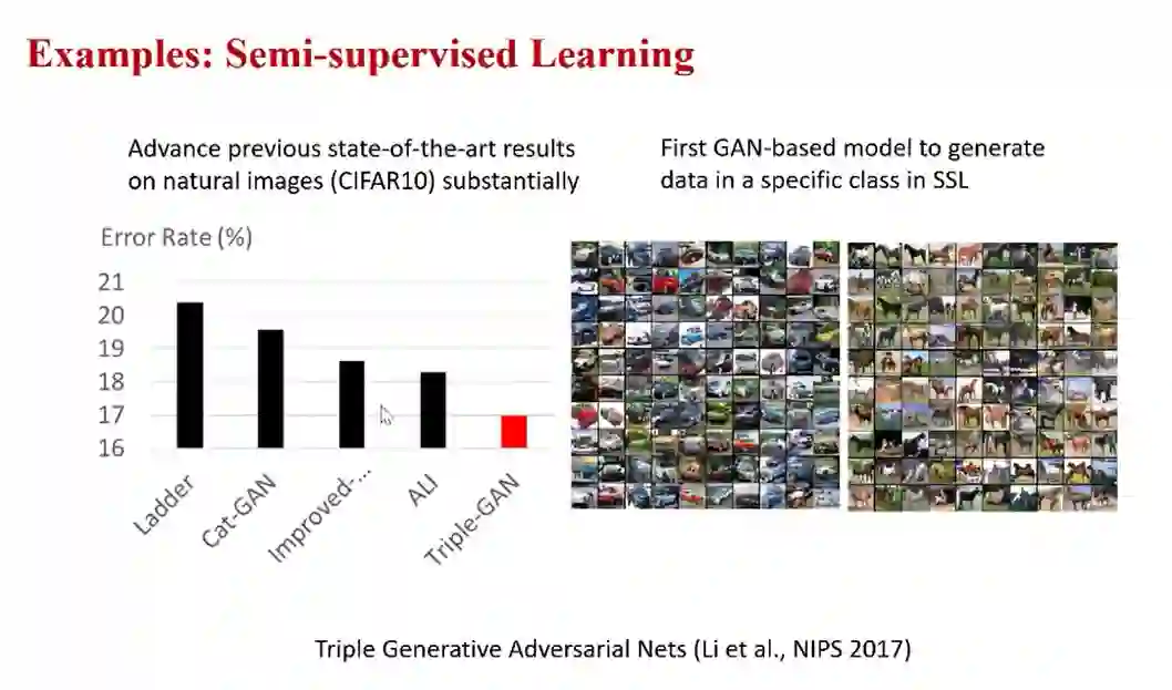 上图例子也是关于半监督学习的,针对如何有效地利用未标注数据得到更好的分类器。这需要对未标注数据进行概率建模,我们当时做了一个叫Triple-GAN的工作,在有完整理论加持下,效果显著。