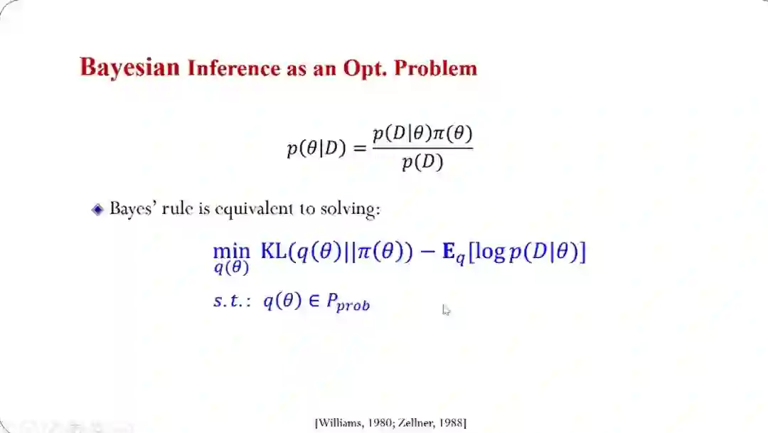 与机器学习里的优化问题结合起来,将贝叶斯推理过程等价成一个最优化的问题,例如最小化一个目标函数,然后添加一些简单的约束,在优化过程中也可以把先验信息、数据等内容考虑进来