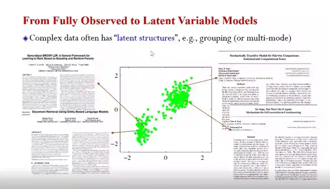 。完全可观测是指所有随机变量的取值,在训练数据里都是完全可获得的。考虑到实际情况,并不是如此“完全”,例如对上图文档集合进行分析,用语言模型进行建模时,会发现数据之间存在复杂的结构(例如不同类的文章用词不同),这些结构在训练集中无法直接观测,这种无法直接观测到的变量被称为隐变量。