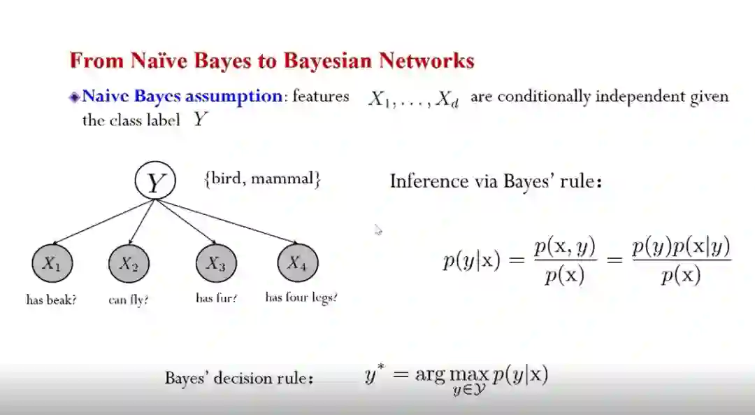开始,上图是形式化的描述。作为一种简单贝叶斯模型,其假设给定标签变量(Y)的情况下,其输入特征是条件独立的。例如,大脑中想象一只鸟,那么就会联想其特征是:飞行、羽毛、腿等等。