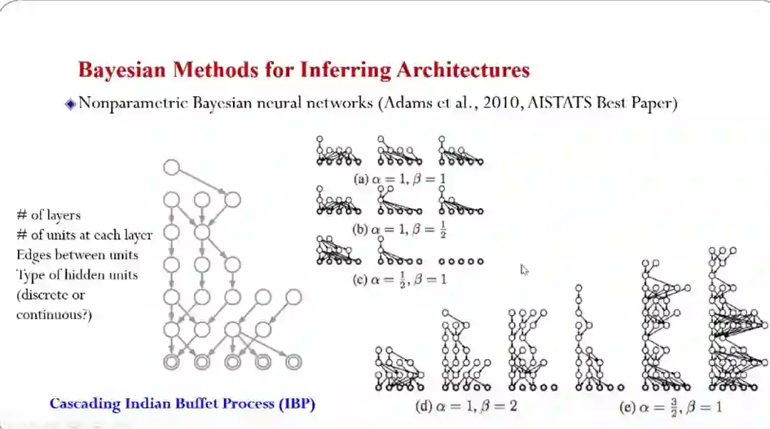 另外,在神经网络结构搜索层面,10年前就有学者研究怎么用贝叶斯的方法生成神经网络的结构,当时用的技术叫做非参数化的贝叶斯,它在理论上是非常优雅的随机过程,可以随机刻画神经网络结构的生成的过程,例如神经网络的层数,每一层的神经元的连接方式等等都可以用随机过程刻画。然后从随机过程中进行采样,每一个样本就对应一个网络结构。当时的一些例子如上图。