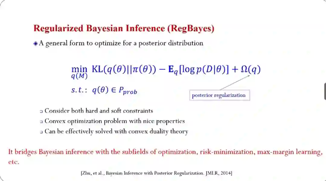 。核心的思想是对后验分布(q)直接进行性质约束,例如定义后验分布在某些分类任务上的性能。这种灵活的建模框架能够完成推理与凸正则化所需的post数据后验分布。当凸正则化是诱导从线性算子的后验分布,可以用凸分析理论求解RegBayes问题。