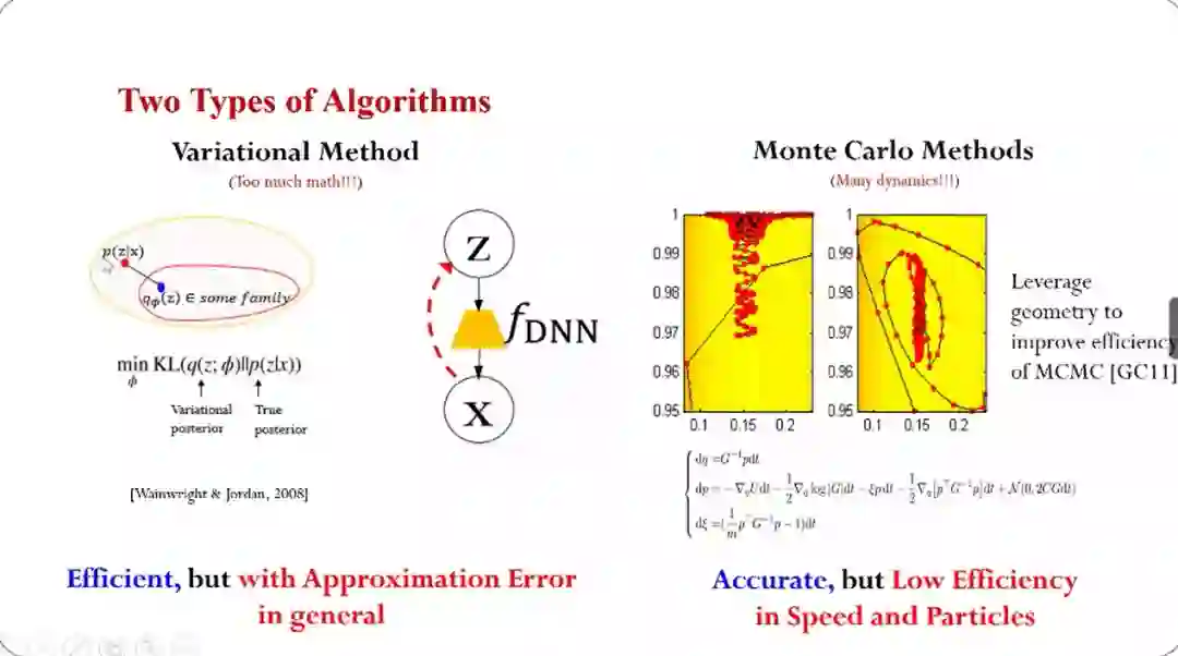 和变分法对应的是蒙特卡洛方法,其采用随机采样的思想,如上图右边所示模拟粒子的演化的过程:粒子不断演化,最终如果模拟时间足够长的话,就会收敛到想要的目标分布。这里也有很多挑战,例如模型参数非常多,那么它的维度就很高。