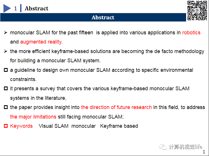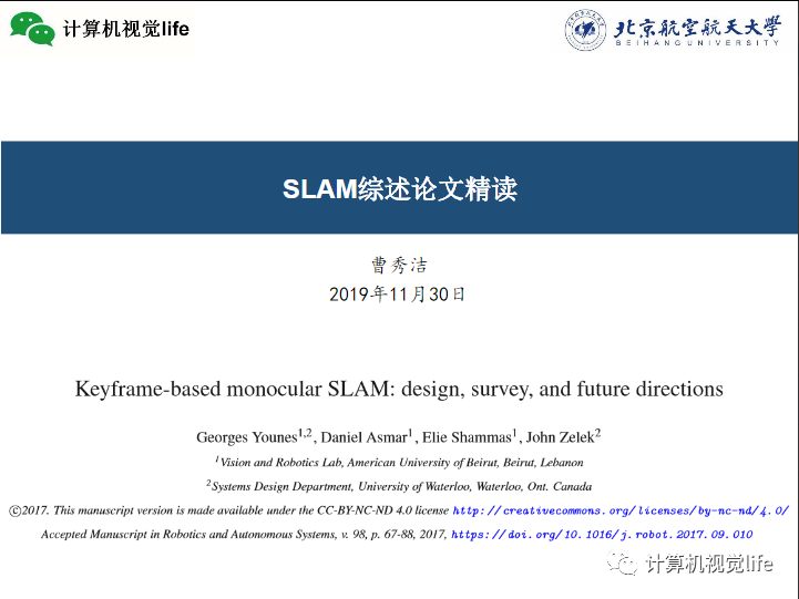 内容:带读SLAM经典论文《Keyframe-based monocular SLAM: design, survey, and future directions》