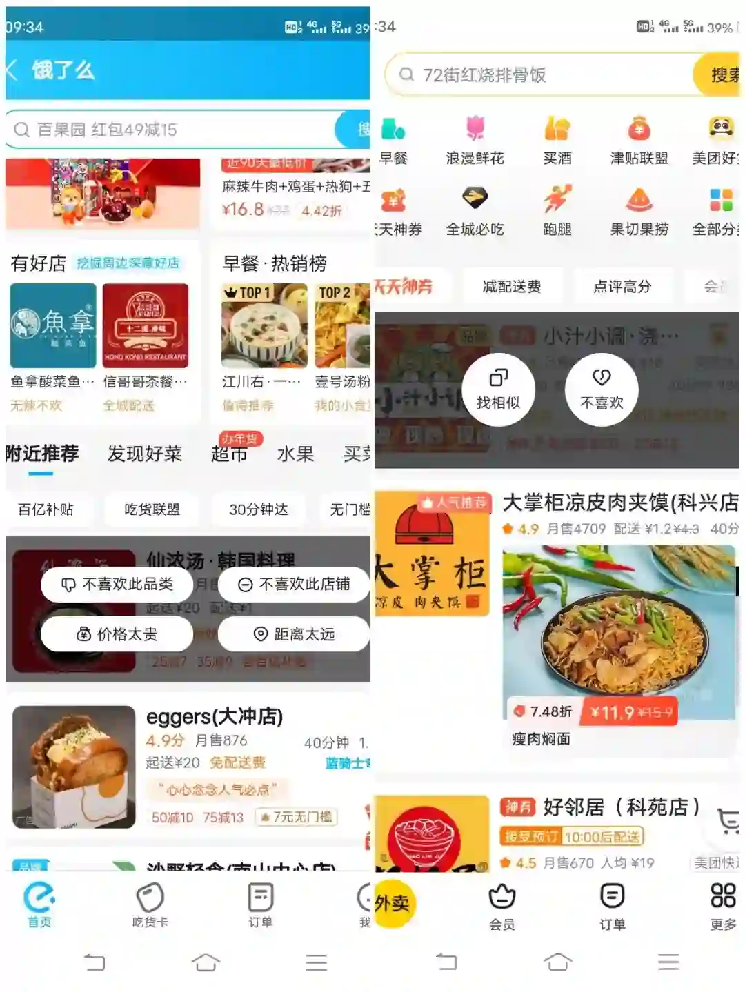 在饿了么可以长按商家卡片,会默认你不喜欢,有四个不喜欢的理由可供选,选择后会直接将该商家置底。