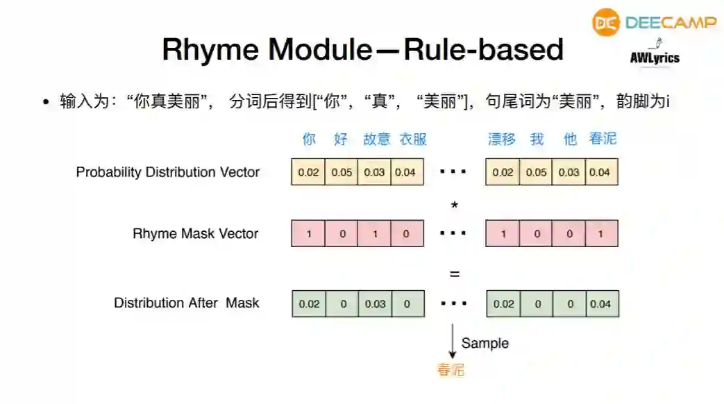 最后我们尝试了基于规则的方式来实现这个押韵。比如输入“你真美丽”,我们根据这个i的韵脚去构建一个向量,做一个简单的操作,就能够得到必然是押韵的结果,同时可以控制押韵的概率。