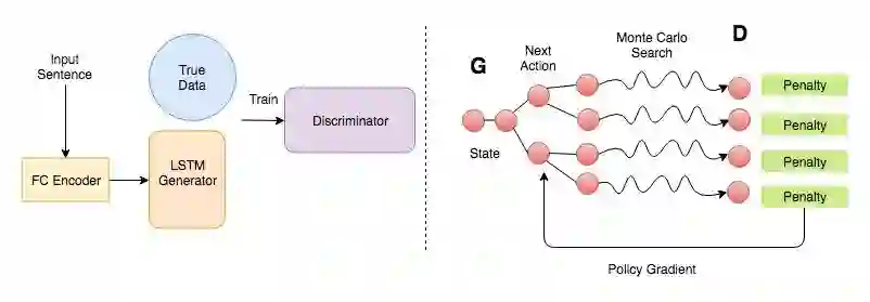1.增加输入语句的编码:这一点类似 Seq2Seq 的 Encoder,SeqGAN 原本的 initial state 是全 0 的,为了将上文的信息传递给生成器,我们采用了一个简单的全连接层(Fully Connected Layer),将输入句子的 Word Embedding 经过一个线性变化之后作为生成器的 LSTM。事实上也可以尝试使用 RNN(LSTM)来作为 Encoder,不过这样模型的速度可能会比较慢。