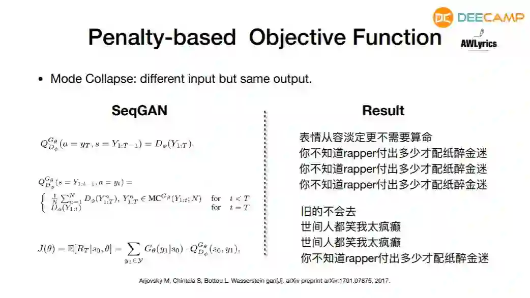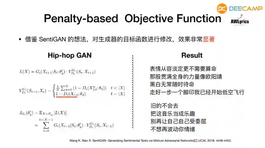 我们知道嘻哈歌手不可能一句话唱一整首,所以我们调研了一些文献,并且借鉴今年SentiGAN的想法,对生成器的目标函数进行修改,最后效果非常显著,有一个质的变化。