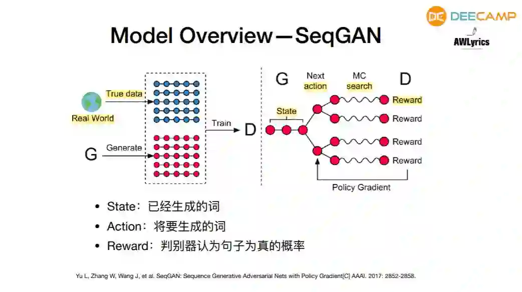SequenceGAN 有两个组件,生成器、判读器,让生成器生成足以逼真的歌词。