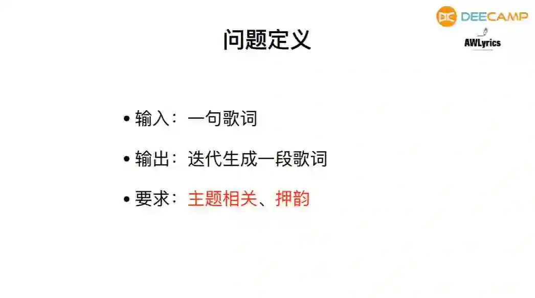 首先我们需要定义这个问题,也就是根据一句歌词迭代生成一段嘻哈歌词。另外一个是押韵,这是嘻哈歌词一大特点。