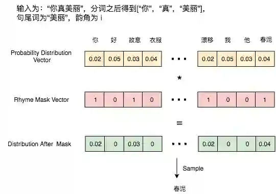 如上图所示,如果我们的输入为“你真美丽”,句尾词为“美丽”,韵脚为 i;最终采样结果只会在押韵的词中采样,示例的采样结果为“春泥”。