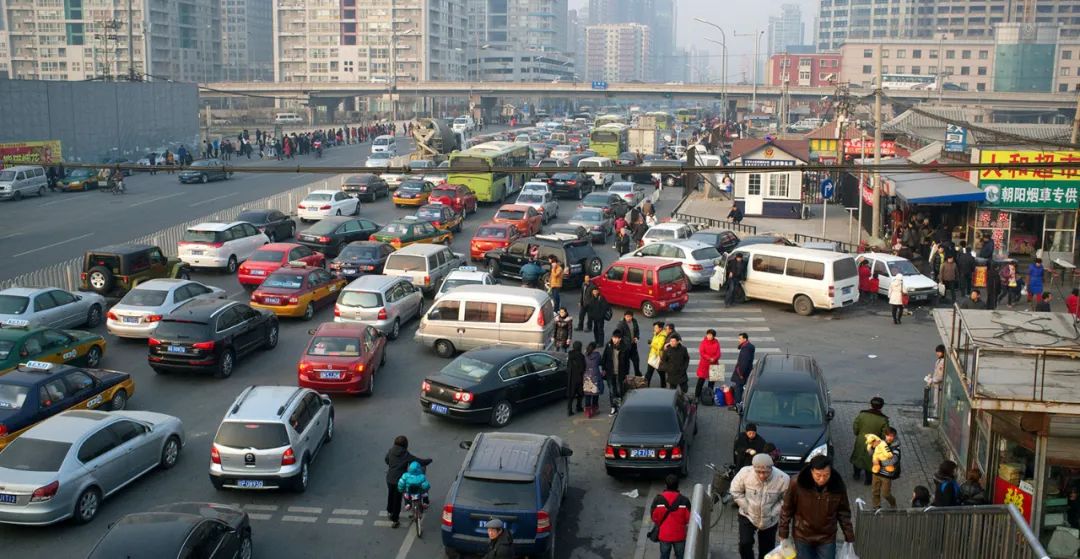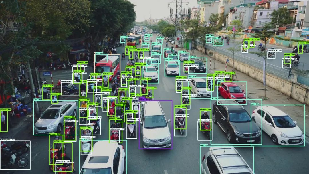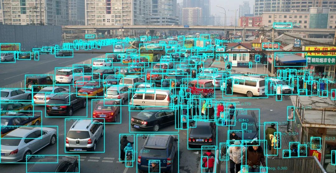 效果很不错,图片中的人与密密麻麻、横七竖八摆放的共享单车大多都检测了出来。接下来我们用一张国内常见的堵车场景来测试一下,车辆、非机动车、行人交错出现在画面中,可以说是非常复杂的场景了。从检测结果可以看出,基本上所有的行人、车辆、背包、袋子等物体都较好地检测了出来。