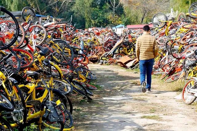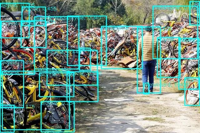 我们先用曾经爆火的共享单车,现如今倒了一大片沦为「共享单车坟场」测试一下效果如何。下图分别为原图与使用本项目的检测结果。