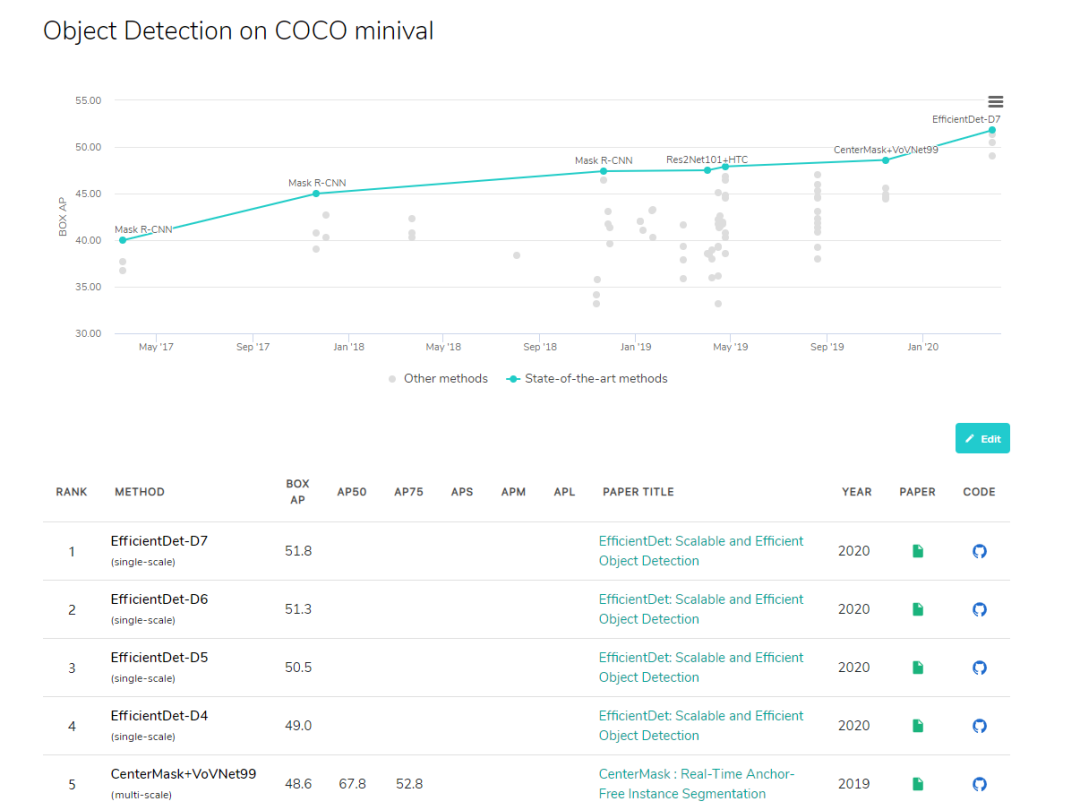 接下来我们来看一下 coco 数据集上目标检测算法的排名,多个屠榜的目标检测网络基于 EfficientDet 构建。一图以言之: