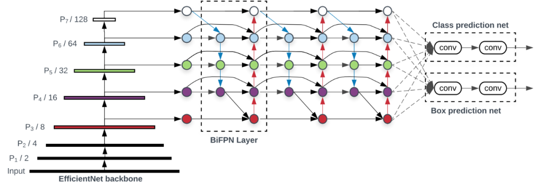 高效的多尺度特征融合。研究者提出一种简单高效的加权双向特征金字塔网络(BiFPN),该模型引入了可学习的权重来学习不同输入特征的重要性,同时重复应用自上而下和自下而上的多尺度特征融合。