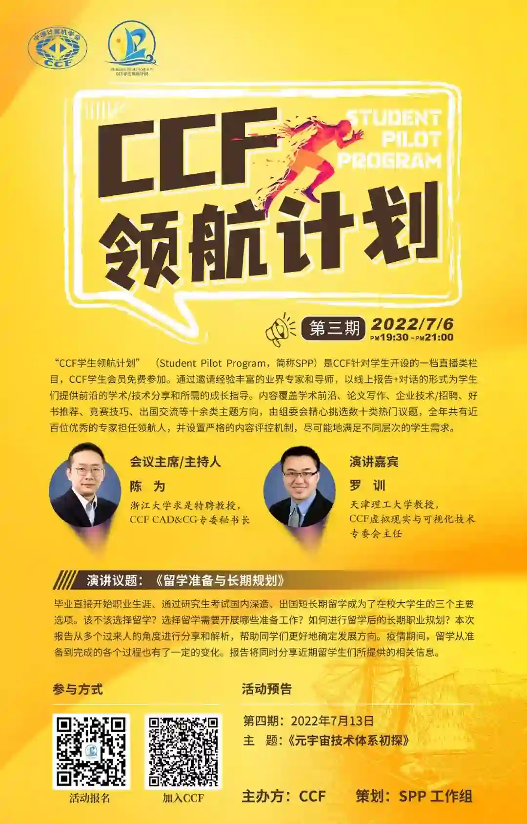 SPP活动时间为每周三晚19:30-21:00,7月6日晚19:30-21:00 SPP第三期由CCF虚拟现实与可视化专委会主任、天津理工大学教授、国家归国高层次人才罗训与同学们交流“留学准备与长期规划”。
