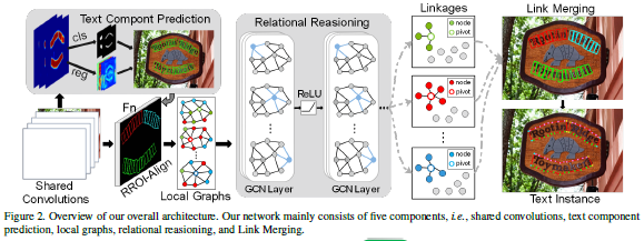 这篇论文提出了一种用于任意形状文本检测的新统一关系推理图网络。在该方法中,局部图通过卷积神经网络桥接了文本提议模型,并通过图卷积网络跨越深度关系推理网络,从而使所提网络端到端可训练。具体而言,每个文本实例将被分成一系列小的矩形组件,并且这些小组件的几何属性(如高度、宽度和方向)将由文本提案模型估算。给定几何属性,本地图构造模型可以大致建立不同文本组件之间的链接。为进一步推理并推论组件与其邻居之间链接的可能性,这篇论文采用基于图的网络对局部图执行深度关系推理。公开数据集上的实验证明了所提方法具有当前最佳性能。