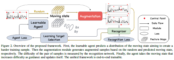 这篇论文提出了一种新的文本图像数据增强方法。与传统增强方法(例如旋转、缩放和透视变换)不同,新方法旨在掌握适当而高效的数据增强方法,对于训练健壮的识别器更有效而具体。新方法通过使用一组自定义基准点变得灵活而可控,并通过联合学习弥合了孤立数据增强过程与网络优化之间的鸿沟。代理网络从识别网络的输出中学习并控制基准点,从而为识别网络生成更合适的训练样本。在包括常规场景文本、不规则场景文本、手写文本在内的各种基准上进行的大量实验表明,这篇论文提出的增强方法和联合学习策略显著提高了识别网络的性能。