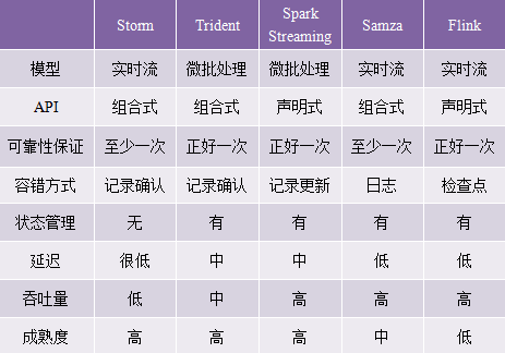 下面是Storm、Trident与另外几种流计算框架的对比: