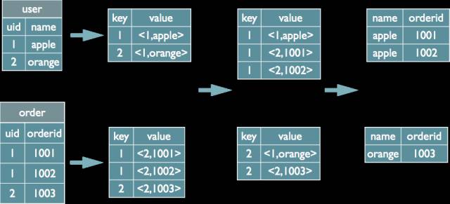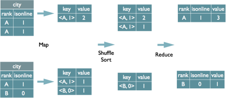 Apache Hive是最早出现的架构在Hadoop基础之上的大规模数据仓库,由Facebook设计并开源。Hive的基本思想是,通过定义模式信息,把HDFS中的文件组织成类似传统数据库的存储系统。Hive 保持着 Hadoop 所提供的可扩展性和灵活性。Hive支持熟悉的关系数据库概念,比如表、列和分区,包含对非结构化数据一定程度的 SQL 支持。它支持所有主要的原语类型(如整数、浮点数、字符串)和复杂类型(如字典、列表、结构)。它还支持使用类似 SQL 的声明性语言 Hive Query Language (HiveQL) 表达的查询,任何熟悉 SQL 的人都很容易理解它。HiveQL被编译为MapReduce过程执行。下图说明如何通过MapReduce实现JOIN和GROUP BY。