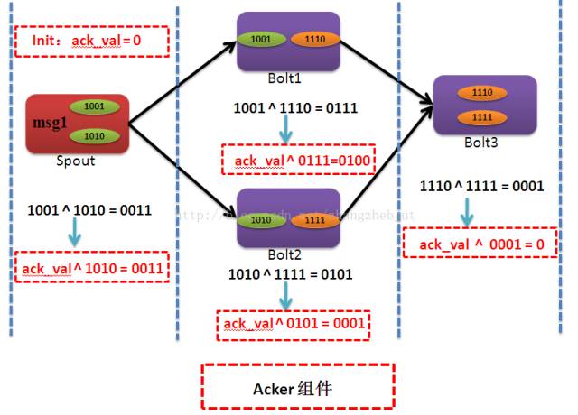 Storm的解决思路,是为每条消息分派一个ID作为唯一性标识,并在消息中包含原始输入消息的ID。同时用一个响应中心(Acker)维护每条原始输入消息的状态,状态的初值为该原始输入消息的ID。每个计算节点成功执行后,则把输入和输出消息的ID进行异或,再异或对应的原始输入消息的状态。由于每条消息在生成和处理时分别被异或一次,则成功执行后所有消息均被异或两次,对应的原始输入消息的状态为0。因此当状态为0后可安全清除原始输入消息的内容,而如果超过指定时间间隔后状态仍不为0,则认为处理该消息的某个环节出了问题,需要重新执行。