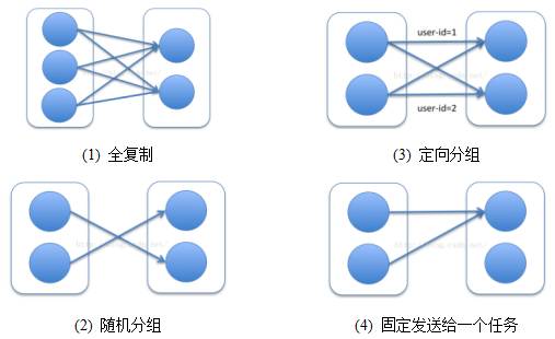 为提高并发性,每一个计算节点对应的数据处理功能被分配到多个任务(相同或不同计算机上的线程)。在设计DAG时,需要考虑如何把待处理的数据分发到下游计算节点对应的各个任务,这在实时计算中称为分组(Grouping)。最简单的方案是为每个任务复制一份,不过这样效率很低,更好的方式是每个任务处理数据的不同部分。随机分组能达到负载均衡的效果,应优先考虑。不过在执行累加、数据关联等操作时,需要保证同一属性的数据被固定分发到对应的任务,这时应采用定向分组。在某些情况下,还需要自定义分组方案。