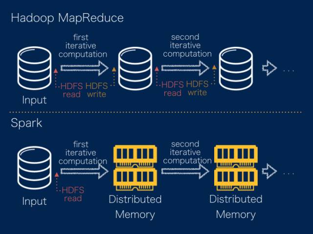 MapReduce中间结果放在HDFS中;Spark中间结果放在内存中,内存放不下时才写入本地磁盘而不是HDFS,这显著提高了性能,特别是在迭代式数据处理的场合。