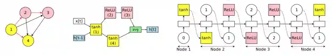图 1:搜索空间中带有四个计算节点的循环单元案例。左图为对应循环单元的计算 DAG,其中红色的边代表图中的信息流。中间为循环单元。右图为 RNN 控制器的输出结果,它将会生成中间的循环单元和左边的 DAG。注意节点 3 和 4 永远不会被 RNN 采样,所以它们结果是平均值,且可以作为单元的输出。