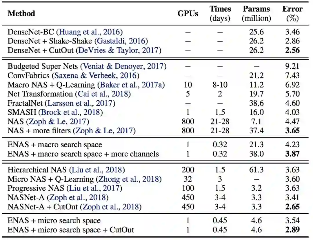 表 2:ENAS 发现的架构在 CIFAR-10 数据集上的分类误差和其它基线结果的对比。在这个表中,第一块展示了 DenseNet,由人类专家设计的当前最佳架构。第二块展示了设计整个网络的方法。最后一块展示了设计模块单元以构建大型模型的技术。