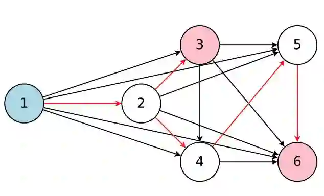 图 2:该图表征了整个搜索空间,同时红箭头定义了其中一个由控制器决定的模型。这里,节点 1 是模型的输入,节点 3 和 6 是模型的输出。