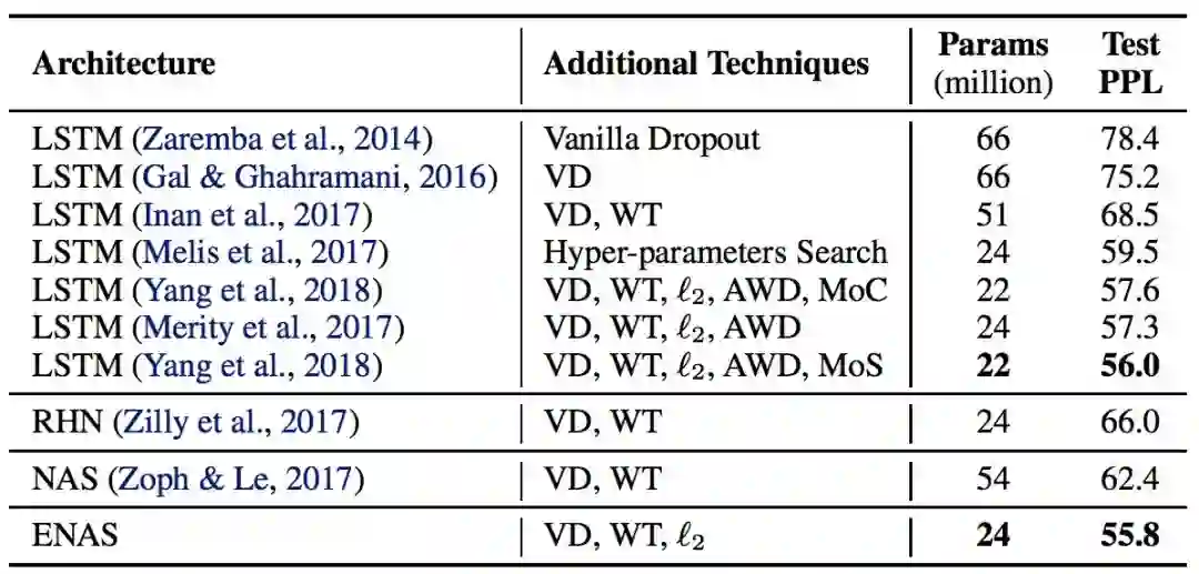 表 1:ENAS 为 Penn Treebank 数据集发现的架构的测试困惑度以及其它的基线结果的比较。(缩写说明:RHN 是 Recurrent Highway Network、VD 是 Variational Dropout、WT 是 Weight Tying、ℓ2 是 Weight Penalty、AWD 是 Averaged Weight Drop、MoC 是 Mixture of Contexts、MoS 是 Mixture of Softmaxes。)